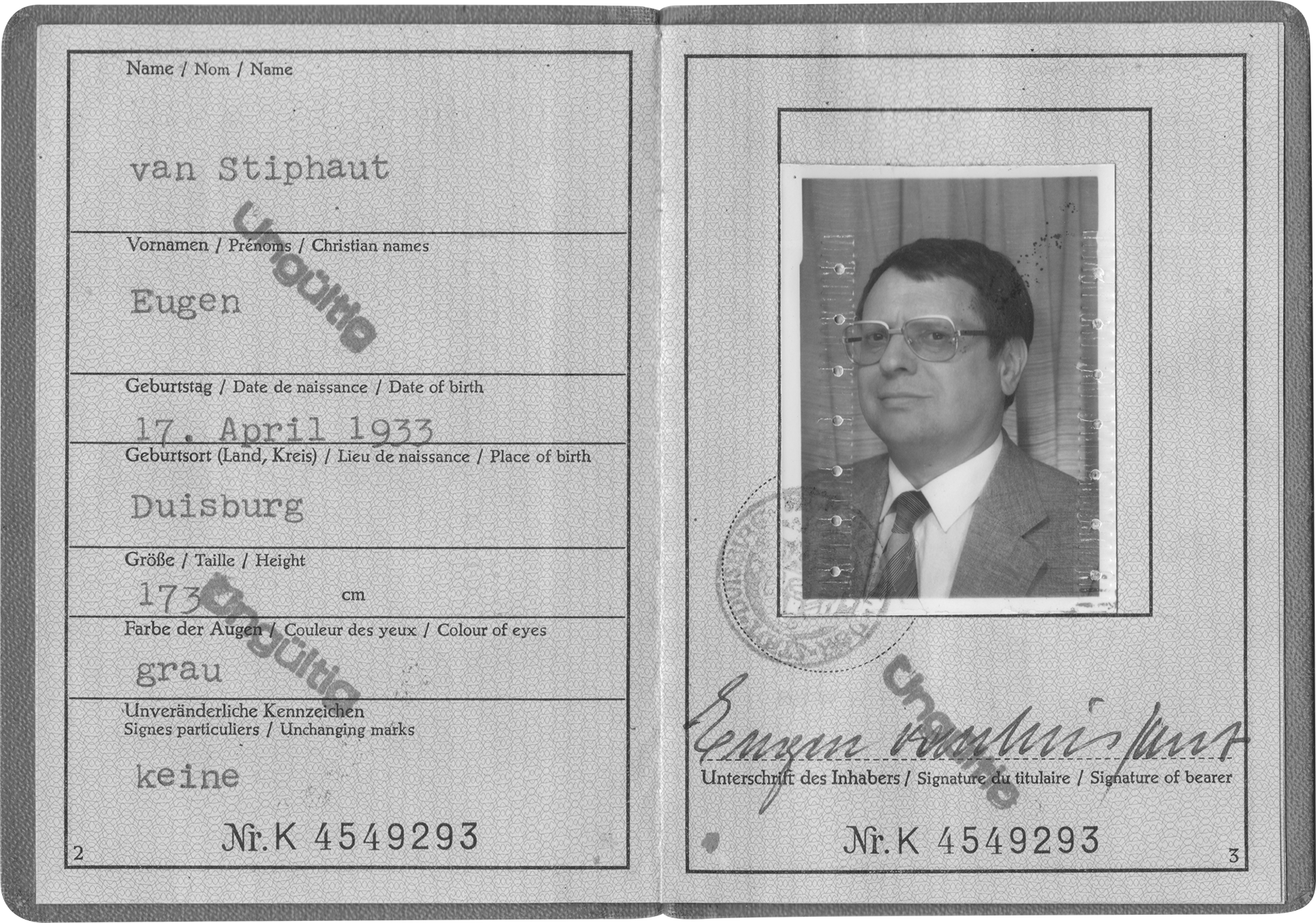Eugen van Stiphaut wird am 17.04.1933 in Duisburg Meiderich als Sohn eines Metzgers geboren. Er ist der älteste dreier Kinder, wobei seine Schwester bereits als Kleinkind verstirbt. Seine Mutter Luise hilft in der Metzgerei des Vaters aus und kümmert sich um den Haushalt.